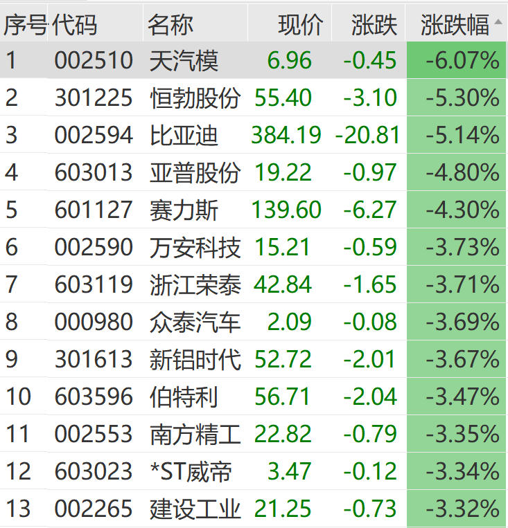 5月26日上午,汽车股集体回调,天汽模跌超6%,恒勃股份、亚普股份、赛力斯等跌幅居前。