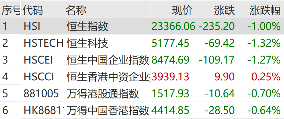 上午港股市场同步下探,截至午间收盘,恒生指数跌1%,恒生科技指数跌1.32%,恒生国企指数跌1.27%。比亚迪股份、吉利汽车跌超7%,领跌恒指成份股。