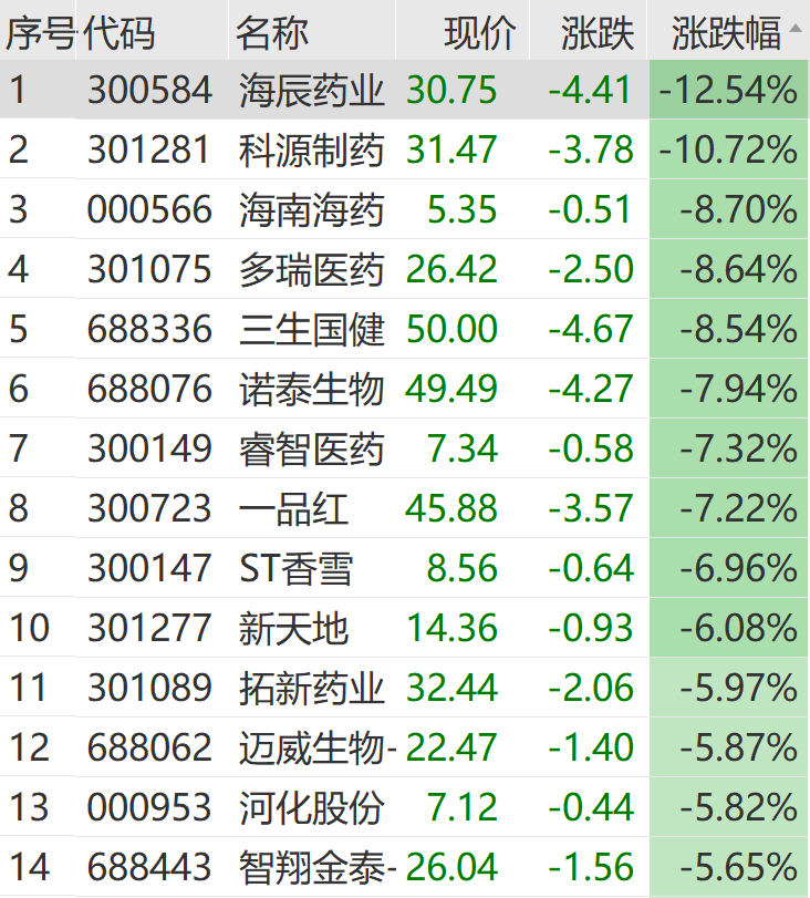 此外,前期火热的医药生物板块上午走低。截至午间收盘,海辰药业、科源制药跌超10%,海南海药、多瑞医药跌超8%。