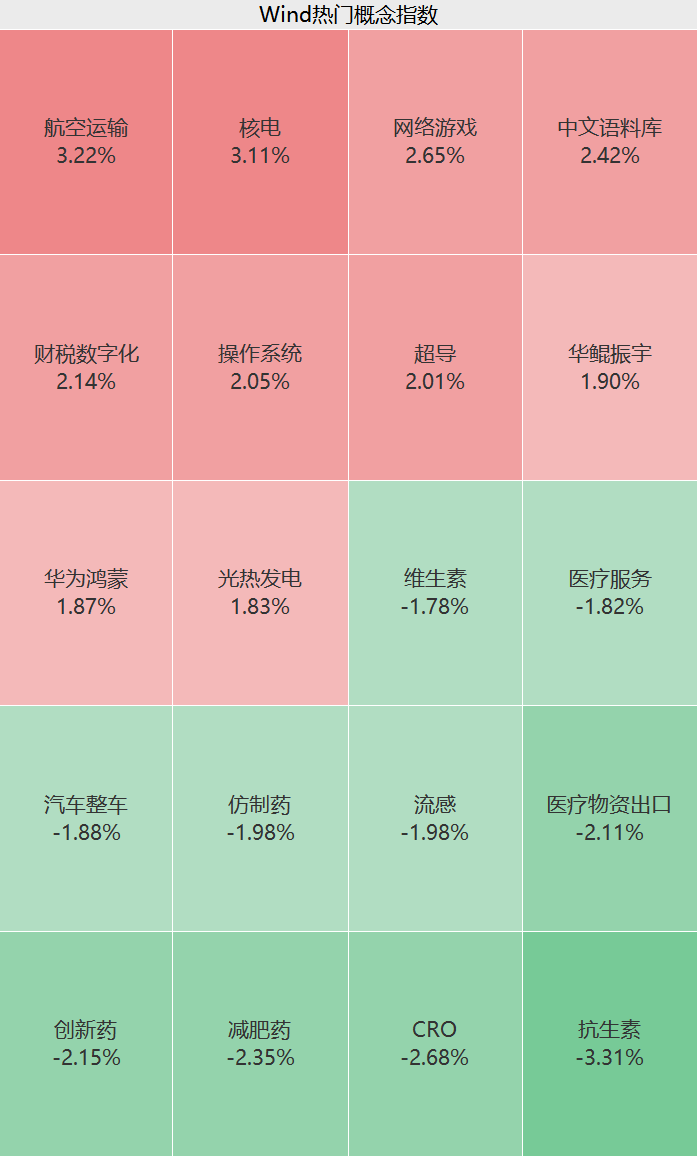 行业板块方面,上午传媒、计算机、国防军工等板块存在局部行情,网络游戏、航空运输、饮料制造、可控核聚变等概念股涨幅居前;医药、汽车等板块明显回调,抗生素、创新药等概念股领跌。