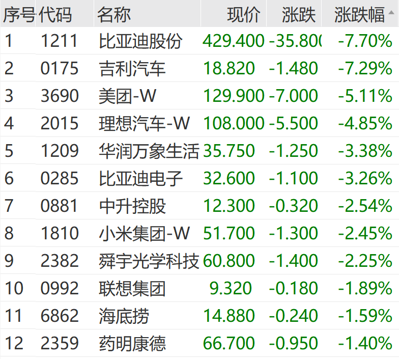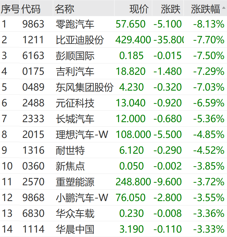 除比亚迪股份外,港股吉利汽车、零跑汽车、东风集团股份、理想汽车、长城汽车等纷纷走低。